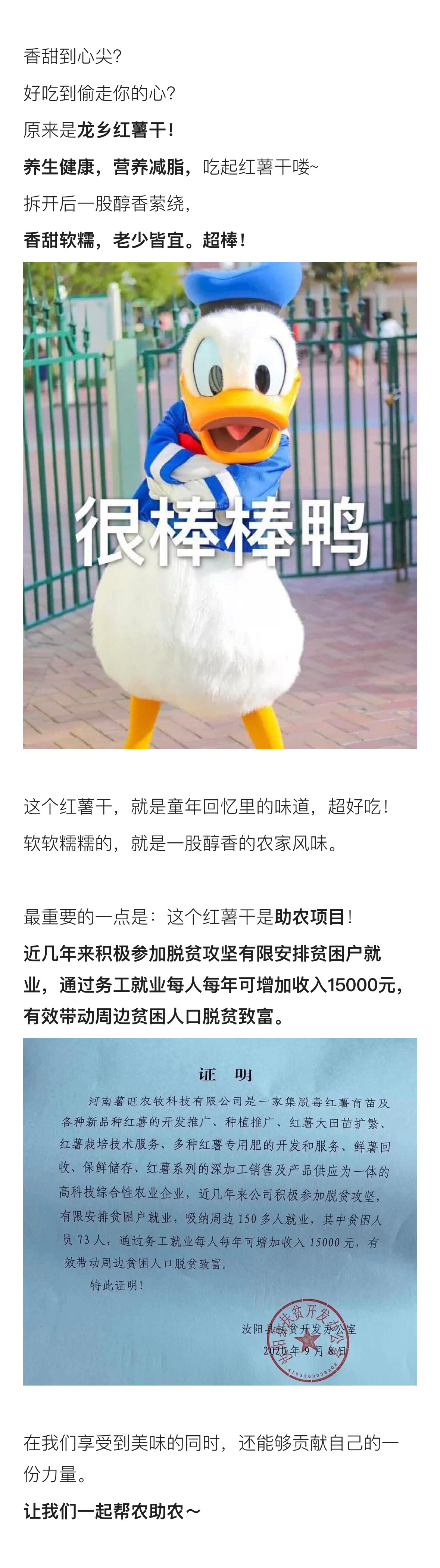 这款红薯干更是助农项目,近几年来积极参加脱贫攻坚有限安排贫困户就业,通过务工就业每人每年可增加收入 15000 元,有效带动周边贫困人口脱贫致富。这年头大家都不容易,互相帮衬吧。
