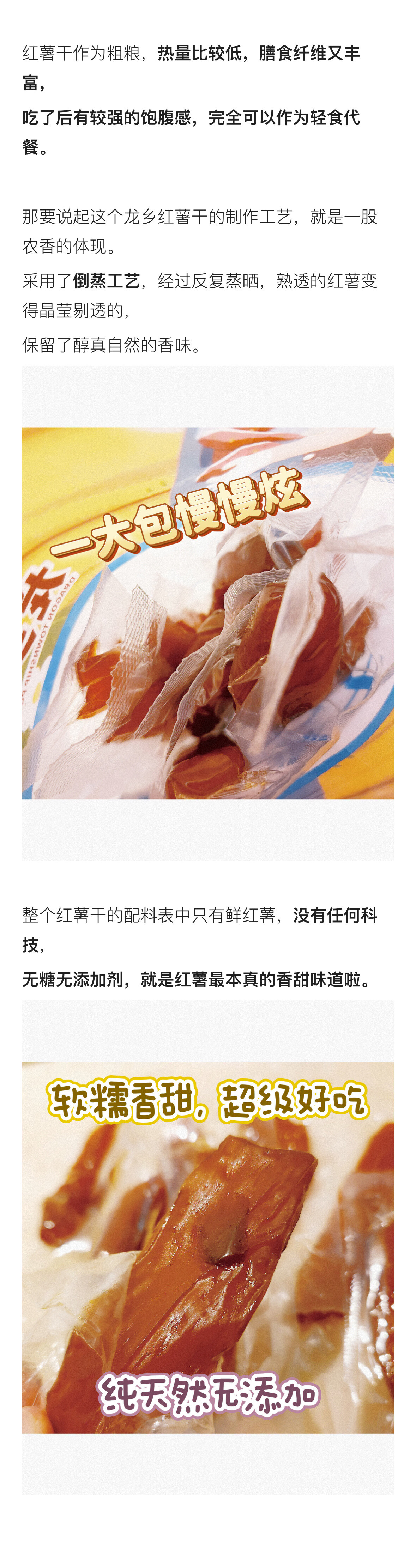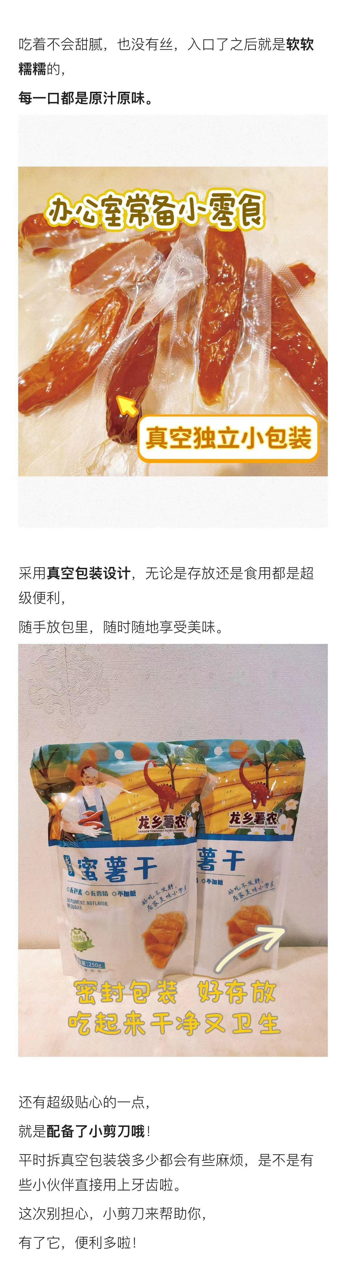 龙乡薯农精选优质红薯制成的红薯干就是无敌的天然琥珀色,无色素、无香精、不加糖,一口咬下去软硬适中,刚刚好的甜度来自红薯本身,大冬天拆一包一口一口细嚼慢咽,特别有满足感。真空小包装,吃起来方便,在办公室备一点总不会错,随时随地补充点膳食纤维,还能分享给同事们!